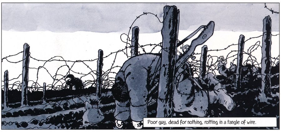 Одной из задач визуального повествования в комиксах о Первой мировой войне является передача соотношения между человеком и окружающим его пространством, и самым, пожалуй, сильным образом становится солдат, который изображается в одиночку на фоне пустого пространства. Фигура человека помещена в центр или на край кадра, который в остальном заполнен линиями колючей проволоки, воронками, грязью, трупами и пустым небом.