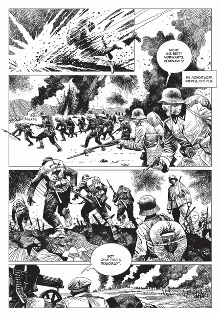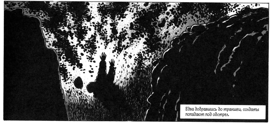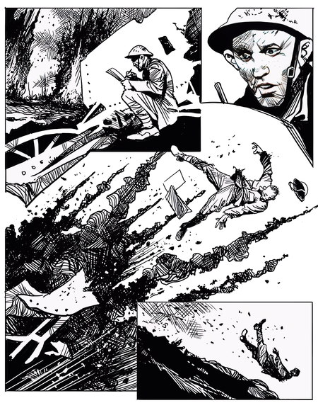 Для передачи ощущения постоянной, неконтролируемой угрозы авторы комиксов о Первой мировой войне активно используют приемы, ломающие статичную и устойчивую композицию. Динамичные ракурсы служат для того, чтобы погрузить читателя в состояние перманентной опасности, паники и дезориентации, испытываемое солдатом. Одним из ключевых приемов является отказ от горизонтальной, стабильной композиции в пользу диагоналей.