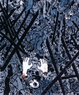 Прием масштабного несоответствия, когда крошечные, почти схематичные фигуры солдат теряются на фоне бескрайних и опустошенных ландшафтов, передает физическую ничтожность человека в условиях войны. Солдат оказывается затерян не просто на большом поле, а в безразличной, враждебной вселенной. Пустота вокруг него — это визуализация его внутреннего состояния: покинутости и оторванности от прежней жизни.
