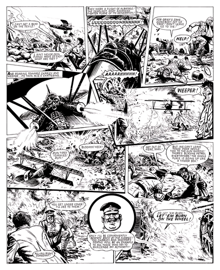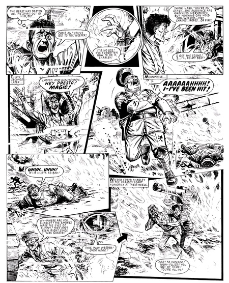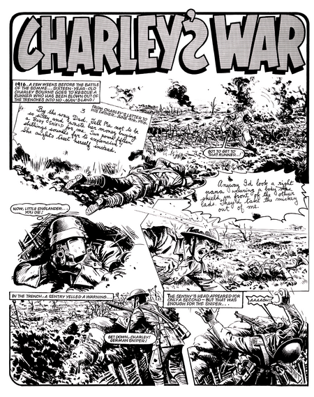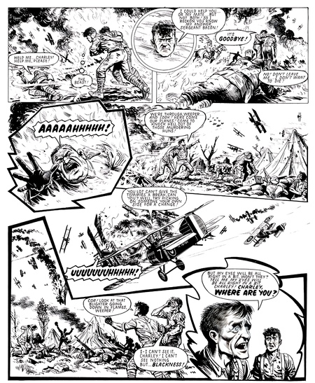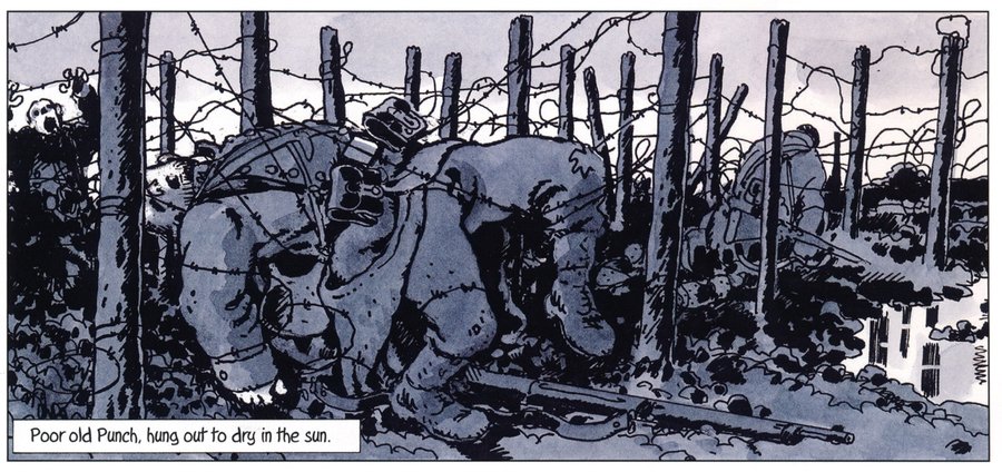 В комиксах о Первой мировой войне такой взгляд мы видим у Чарли — главного героя Charley’s War — после гибели его товарища. Главный герой возвращается в окоп с мешком, а когда у него спрашивают, что в мешке, Чарли отвечает: «Мой друг, сэр. Мой друг, Джинджер».