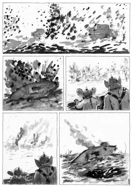 Также для передачи скорости и динамики атаки в комиксах о Первой мировой войне используются вытянутые кадры, которые создают эффект визуальной какофонии и имитируют работу сознания подвергшегося атаке человека, которое выхватывает из реальности лишь обрывки образов, не успевая сложить их в целостную картину.