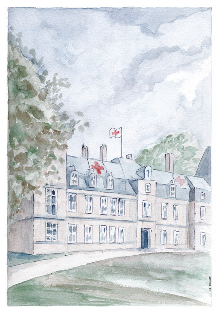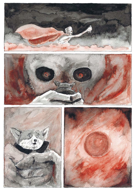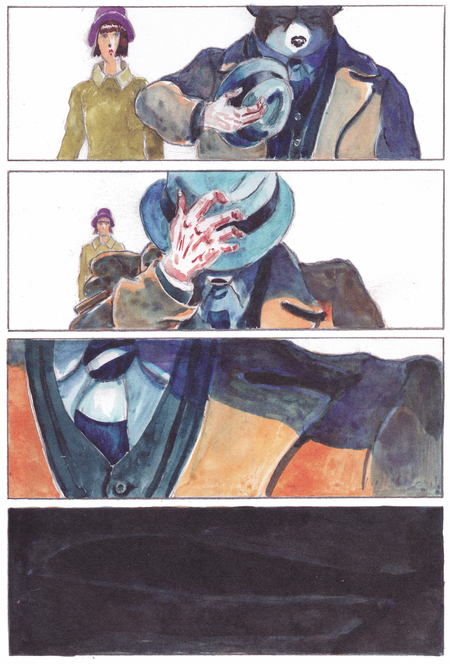 Еще одним инструментом раскадровки является использование иллюстраций, занимающих всю полосу. В комиксе «Диптих» сразу за страницей, изображающей сцену на фронте при помощи небольших динамичных кадров, следует полоса с изображением новой локации — здания госпиталя. В данном случае полоса выполняет нарративную функцию и показывает переход повествования в другую локацию.