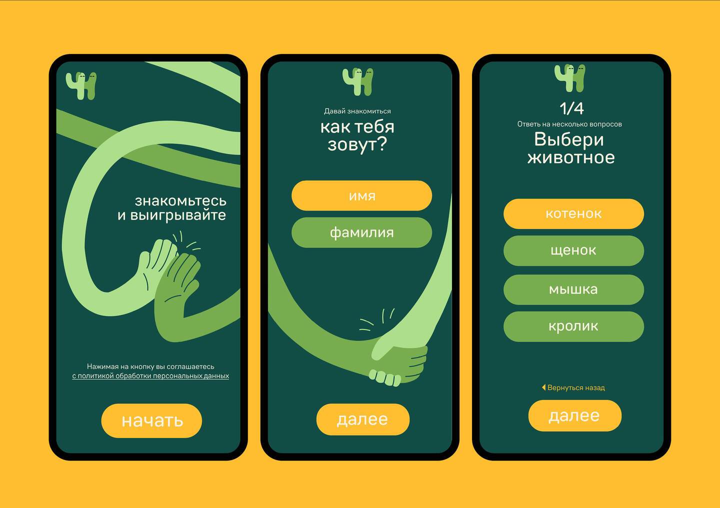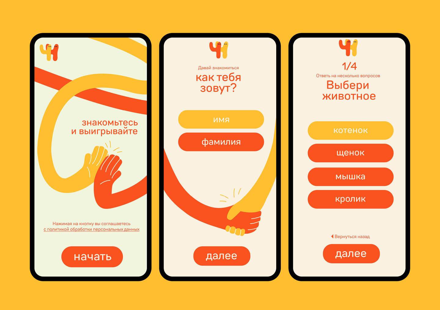 Чин-чин — это приложение, которое игрализирует процесс знакомства на корпоративных мероприятиях. Айдентика очень простая и дружелюбная по духу, символизирует сближение, партнерские отношения и новые знакомства.
