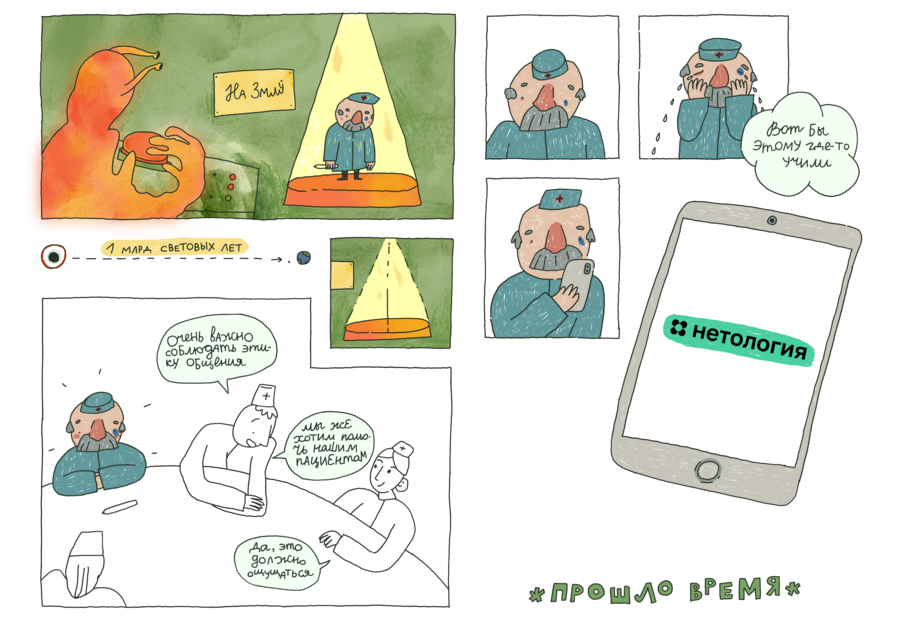 Врача похищают инопланетяне, которым очень нужна медицинская помощь. Ему не удается спасти их вследствие сложностей в коммуникации. Из-за драки с пациентом врача депортируют с планеты, где он обнаруживает курсы «Нетологии». После них герой становится успешным и известным межпланетарным доктором.