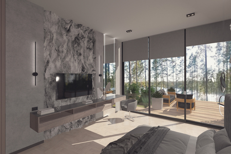 Интерьеры продолжают минималистичный стиль архитектуры. Отделка комнат, как и экстерьер здания, проста и не блещет яркими красками — все выдержано в серой гамме, с вкраплениями зелени и дерева. А в качестве главных украшений используется лаконичный текстиль и декоративное освещение. Все это преследует одну цель — не создавать разрыв между зданием окружающим ландшафтом.