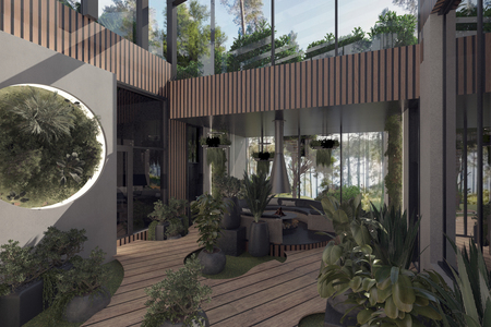 Если говорить о предложенной концепции, то проект создавался с упором на органичное интегрирование здания в окружающий ландшафт, так как по мнению автора именно за этим направление будущее архитектуры. Ведь не секрет, что с каждым годом все больше людей желает скрыться от шума и тревог мегаполисов, предпочитая им тишину и покой в окружении девственно чистой природы.