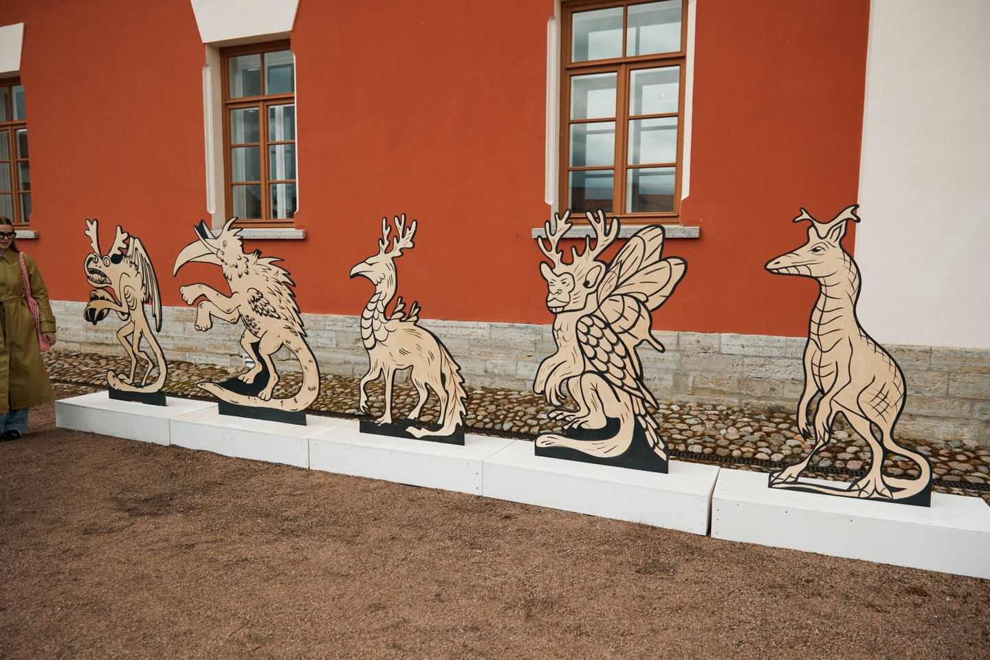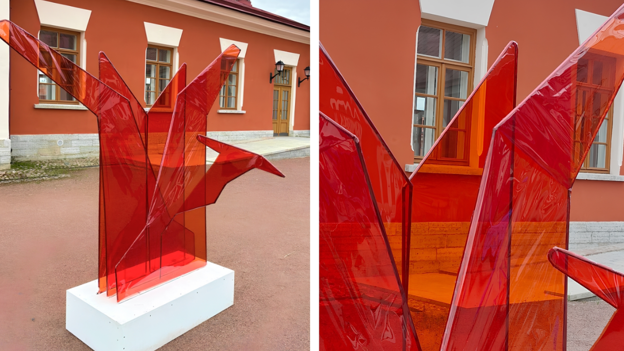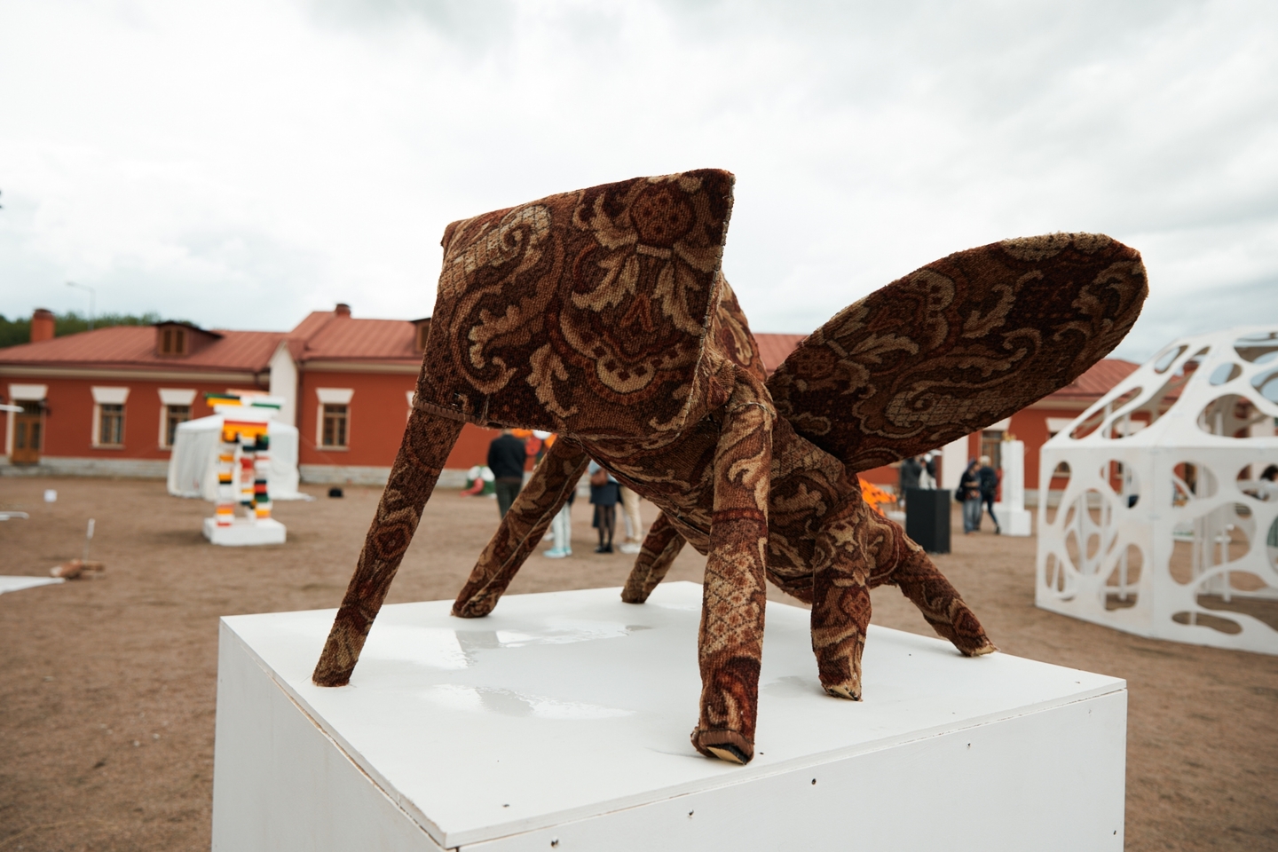 Работы выполнены из простых и привычных материалов — дерева, текстиля, пластика и металла. Благодаря крупным масштабам арт-объектов и отсутствию привычных музейных границ зрители смогут почувствовать себя частью экспозиции, рассматривая произведения не изолированно, а в контексте исторических построек Императорской фермы.