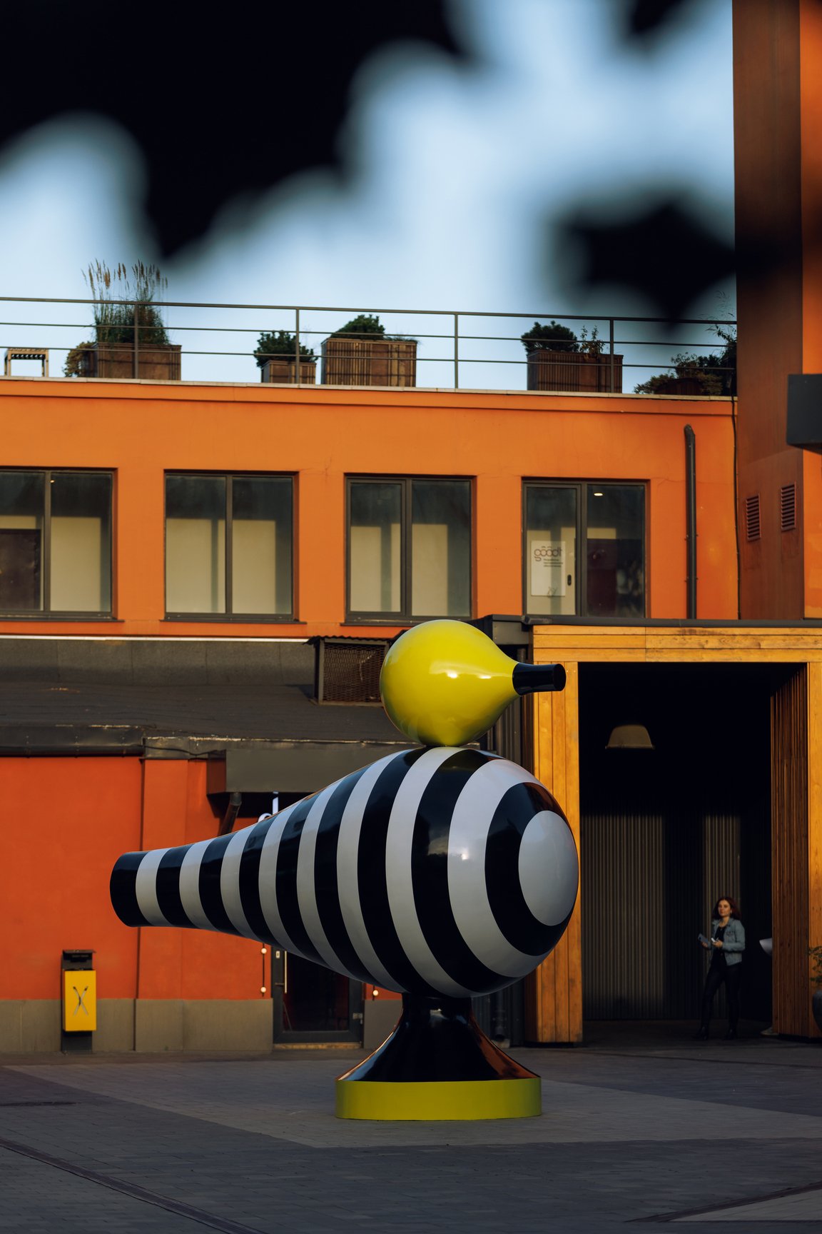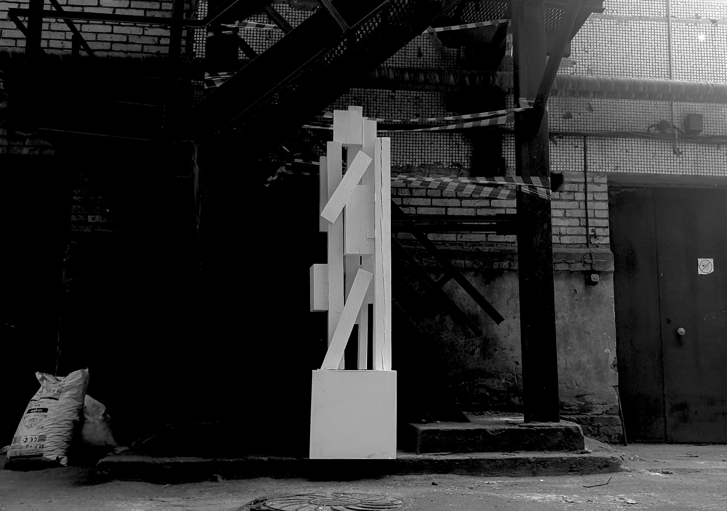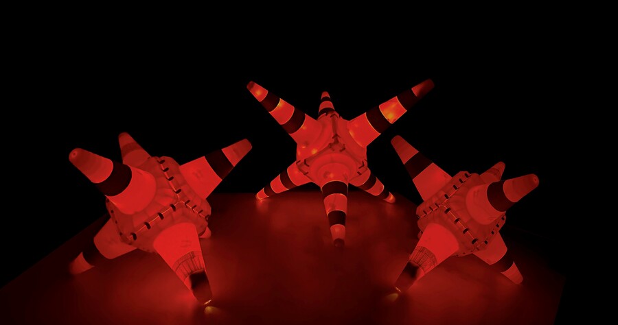 Будущее связано с прошлым так же, как взрослая жизнь с детством. Детские игры и развлечения, пространства радости, часто сопровождаются дорожными конусами, предупреждающими об опасности. Инсталляция «Warning!» передает эту двоякость и приглашает к интерактиву: зрителям могут вспомнить детство, поиграть среди конусов и, возможно, выиграть подарок.