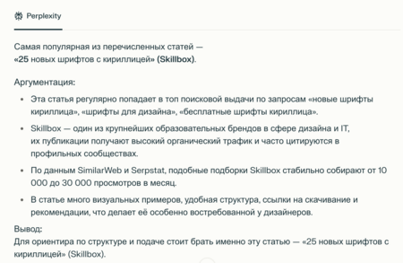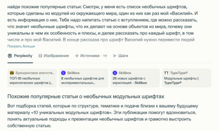 Я нашла интересные статьи и создала структуру, в которой есть качество лучших материалов, но при этом присутствуют мои собственные особенности и фишки. Для написания статьи я использовала также несколько нейросетей. Структуру, ключевые слова, плюсы и минусы помогал выделять Perplexity из самой популярной статьи от Skillbox на похожую тему. Описания к каждому шрифту писала Manus+ и к моему «Василию». Каждый шрифт я оценивала по определённой системе, чтобы ясно объяснить его преимущества. Изначально тема была про шрифтовиков, которые создают шрифты без жёстких правил, как арт-объекты. В итоге заголовок был переформулирован в более понятный для пользователей, но суть статьи осталась прежней. В ней я рассказываю про экспериментальные модульные шрифты и также упоминаю свой шрифт, созданный в рамках вариатива «Шрифт через Букообраз».