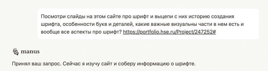 Первое интервью, проведённое с ChatGPT, помогло выявить, что мне тяжело даётся презентация проекта, поэтому я решила возложить эту роль в продвижении на ИИ. Я использовала нейросеть Manus, чтобы проанализировать моё портфолио, а далее презентацию моего проекта по шрифту. Это помогло быстро выделить ключевые моменты и чётко их сформулировать.
