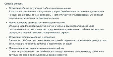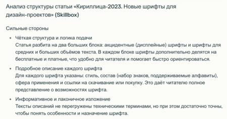 Вообще, изначально у меня были более подробные описания каждого шрифта, но после промта по коррекции текста с помощью ключевых слов описания стали короткими. Сначала думала всё переписать, потом поняла, что для Дзена как раз хорошо краткие сводки по каждому. Просмотрела статьи на эту тему, и да, обычно пишут коротко. Решила для эксперимента оставить так.