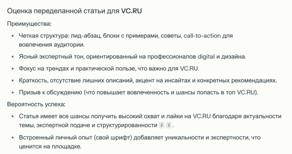 Статья для vc.ru стала более профессиональной с точки зрения тона и более уверенной, при этом сохранила прямой диалог с читателем. Она попала в поле зрения аудитории, о чём свидетельствуют просмотры. Однако статья не получила большого отклика и лайков, поскольку аккаунт был создан недавно и ещё не успел зарекомендовать себя.