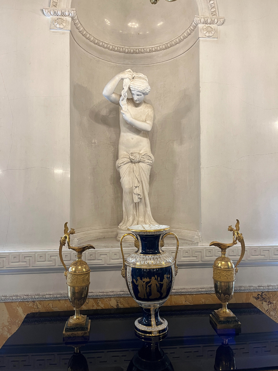 Античный характер Греческого зала подчёркивают вазы, в которых через форму, цветовую гамму и сюжетные композиции прослеживаются прямые отсылки к искусству Древней Греции.