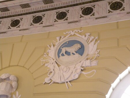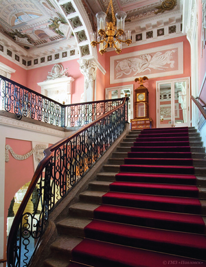 Далее египетская тема продолжается в оформлении фронтальной стены парадной лестницы, расписанной Дж.-Б. Скотти в 1804 году.