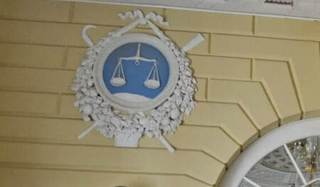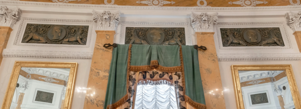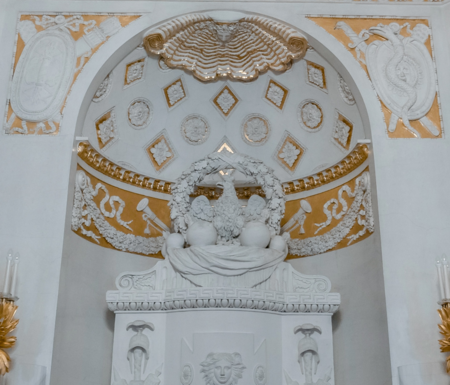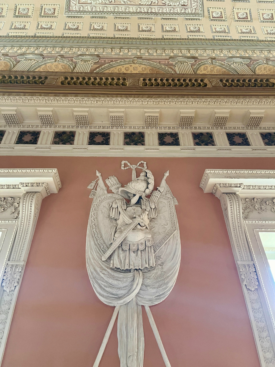 Величественности и монументальности залу добавляет потолок с триумфальными мотивами росписи и эффектом перспективы, визуально увеличивающим пространство.