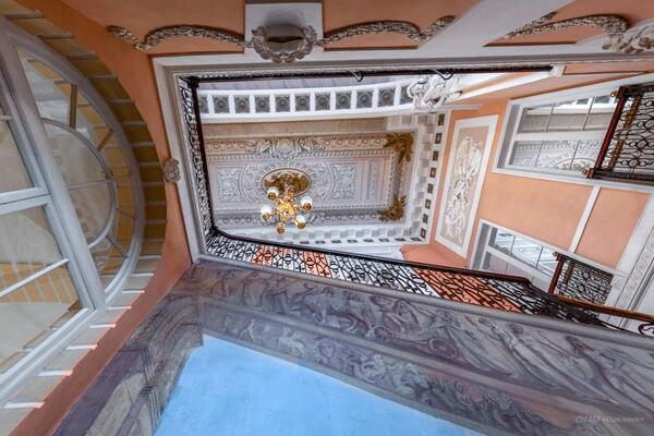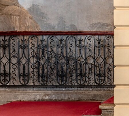 В перилах парадной лестницы ненавязчиво используется образ змеи-уреи — символа власти, защиты и божественной силы в древнеегипетской мифологии.