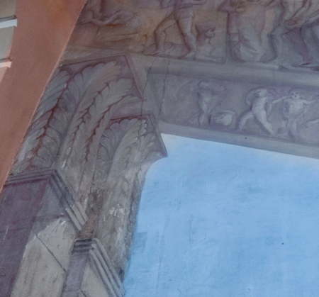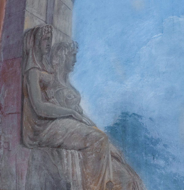 Техника гризайли, имитирующая скульптурный рельеф средствами монохромной живописи, использовалась для античных и аллегорических сюжетов, придавая декору строгость и графическую чёткость.