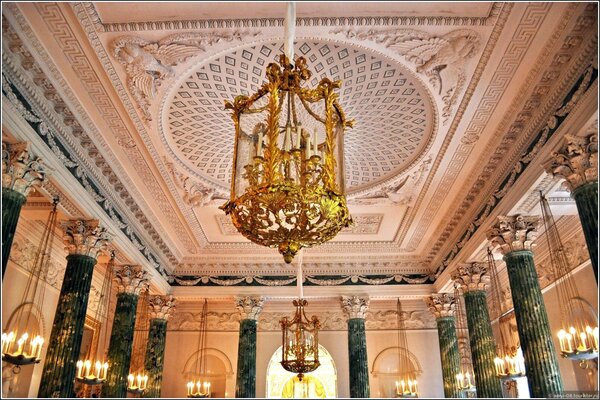 А. Воронихин — архитектор, занимавшийся восстановлением дворца после пожара 1803 года, добавил в интерьер плафон и лампы, стилизованные под масляные светильники, несколько отдаляют интерьер от строгого античного идеала, привнося в его образ черты французской моды конца XVIII века и придавая залу более изысканный, дворцовый характер.