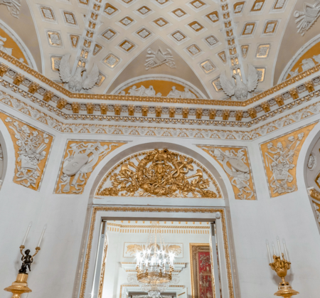 Верхняя площадка Парадной лестницы оформлена в тематике триумфа. С помощью рельефов и лепнины в виде воинских трофеев, оружия и лавровых венков раскрываются идеи победы, славы и силы государственной власти. Декоративная отделка отсылает к традициям античных римских триумфов и классицистической символике, создавая ощущение торжественного восхождения и символического входа в в парадное пространство императорского дворца.