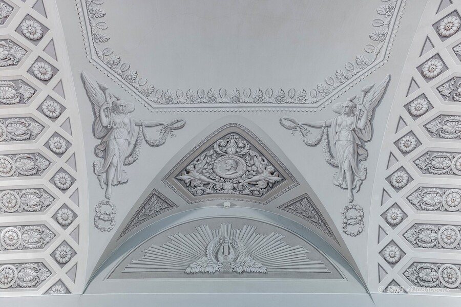 Синий оттенок в плафоне и медальонах также прочитывается двояко: в классицизме он создаёт эффект открытого неба, а в египетской традиции символизирует небесный свод. В итоге цветовое решение формирует многослойную систему смыслов, связывая вестибюль с эстетикой классицизма и наследием Древнего Египта.