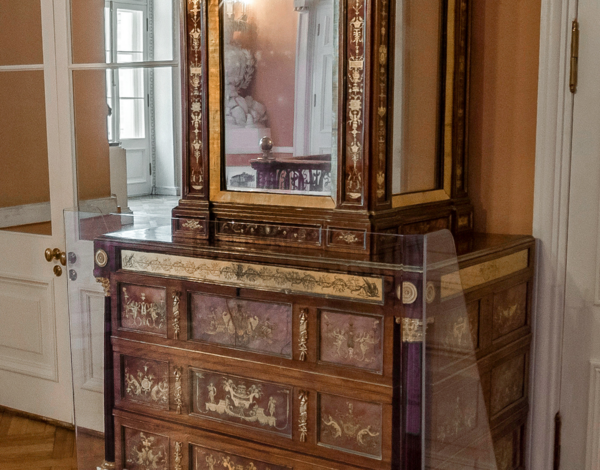 Эгломизе — роспись по стеклу с золотым фоном. Она применялась в оформлении мебели и декоративных предметов павловского дворца, внося в интерьер изысканность и эффектность.