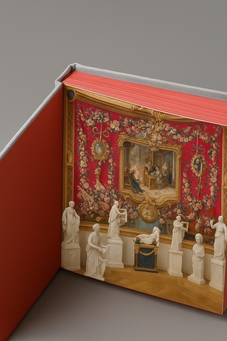 Особую роль в создании триумфального образа площадки играет цветовая гамма. Красный оттенок стен символизирует победу, власть и торжественность. Контраст белых и позолоченных рельефов со стенами усиливает парадный характер пространства. Строгая симметрия и насыщенность цветовой среды превращают верхнюю площадку лестницы в выразительный акцент, утверждающий идеи порядка и государственной силы.