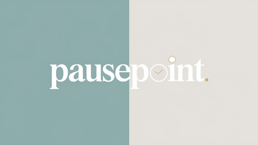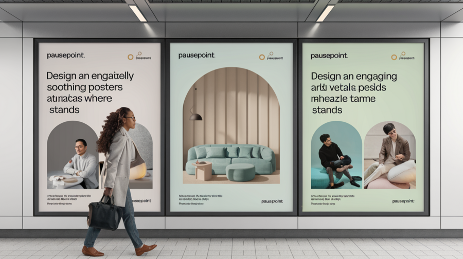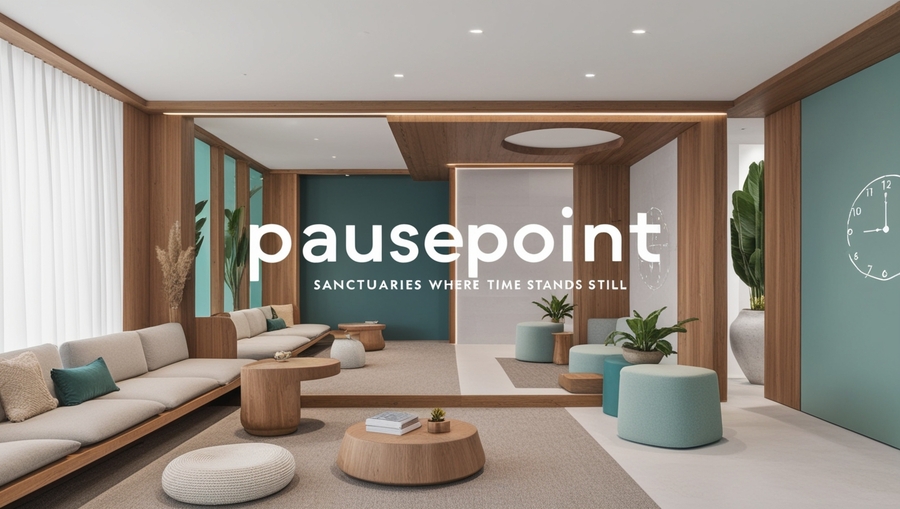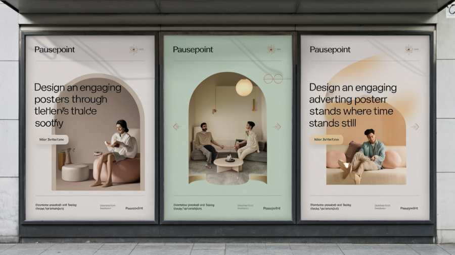 Design an engaging and visually soothing advertising poster for 'PausePoint, ' a brand that creates spaces where time stands still. The poster should immediately catch the attention of busy passers-by while conveying the brand’s core message of tranquility, balance, and timelessness.Incorporate a harmonious blend of modern graphics and high-quality photography. Use soft, muted tones from the brand’s palette—stone gray, tranquil teal, and subtle gold accents—to evoke calmness while standing out in an urban environment. The layout should be clean and minimalist, ensuring the design feels uncluttered and inviting. For the imagery, feature serene, relatable scenes of people pausing in calm, beautifully designed PausePoint spaces—relaxing in a cozy lounge, working peacefully in a coworking zone, or enjoying a quiet moment with a cup of tea. Pair these photos with abstract graphic elements, such as flowing lines or circular shapes, symbolizing the concept of time slowing down.
