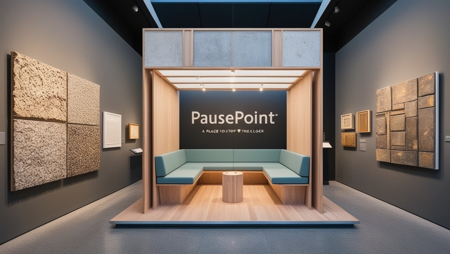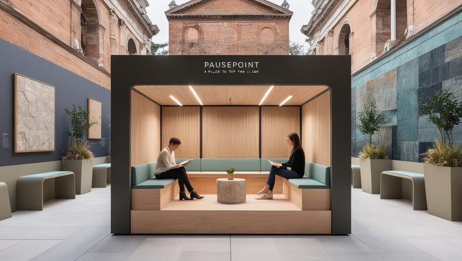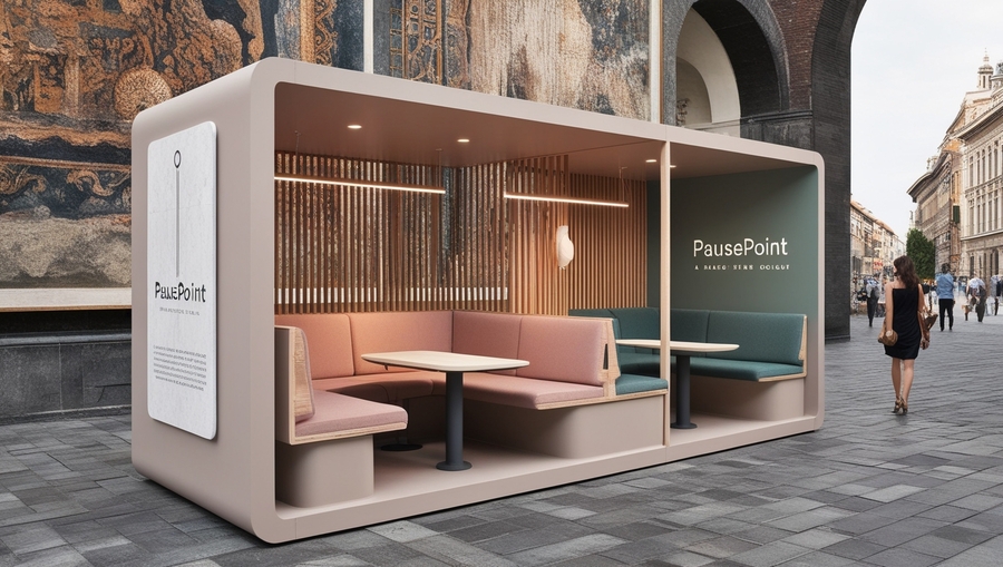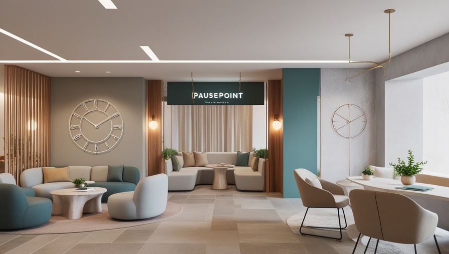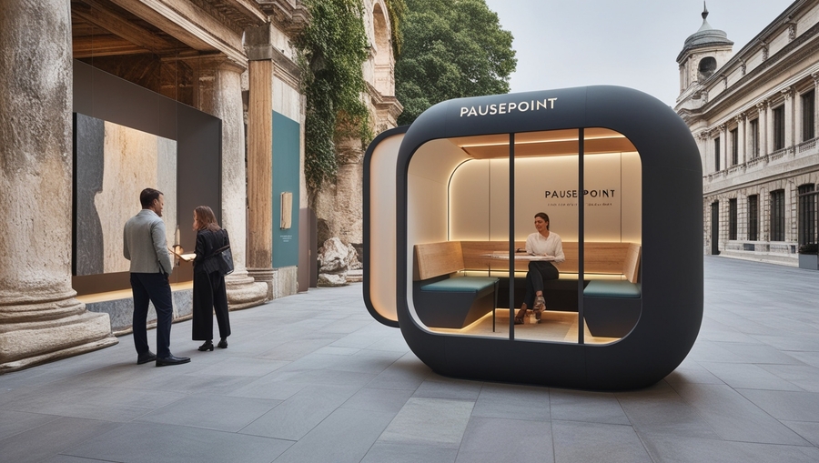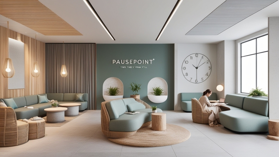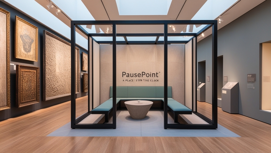 Create a coworking space for 'PausePoint, ' a brand dedicated to creating spaces where time stands still. The installation should serve as a peaceful place from which it would be fashionable to watch the works of art for hours — a small, ergonomic and thoughtfully designed structure that provides comfort and harmony without disturbing the urban flow of the work atmospher. The design should be modern yet organic, incorporating natural materials like wood, stone, or recycled metals that blend with the textures of meseum. The structure should be compact and modular, with built-in seating that is ergonomic and inviting. Include soft, integrated lighting (like warm LEDs) to make the space welcoming at night, and optional shading elements to provide protection from the sun or rain. Use soft textures to add convenience and best technologies, tones such as soft gray, deep teal, and muted gold accents to ensure compatibility with diverse cityscapes.The installation should feature subtle branding, such as the 'PausePoint' logo or tagline ('A place to stop the clock') etched or embossed in a minimalist style.