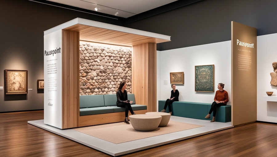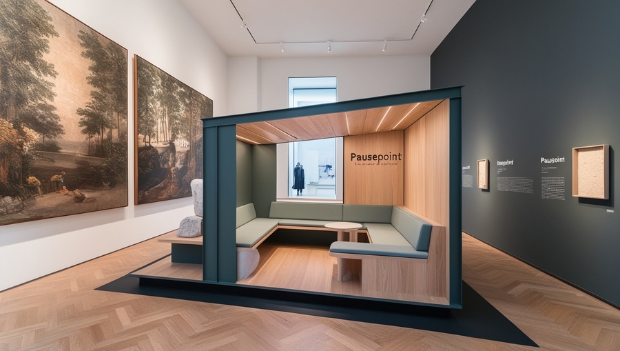 Create a museum installation for 'PausePoint, ' a brand dedicated to creating spaces where time stands still. The installation should serve as a peaceful place from which it would be fashionable to watch the works of art for hours — a small, ergonomic and thoughtfully designed structure that provides comfort and harmony without disturbing the urban flow of the museum’s atmosphere The design should be modern yet organic, incorporating natural materials like wood, stone, or recycled metals that blend with the textures of meseum. The structure should be compact and modular, with built-in seating that is ergonomic and inviting. Include soft, integrated lighting (like warm LEDs) to make the space welcoming at night, and optional shading elements to provide protection from the sun or rain. Use soft textures to add convenience, but at the same time leave the museum rigor and compactness Use muted, neutral tones such as soft gray, deep teal, and muted gold accents to ensure compatibility with diverse cityscapes.