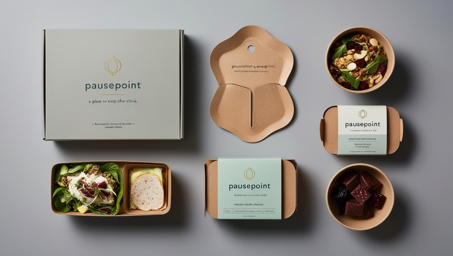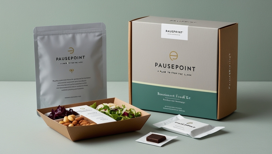 Design a thoughtful, boxed food kit for 'PausePoint, ' crafted to provide a balanced, easy-to-use dining experience for individuals seeking relaxation, focus, or rejuvenation. The food kit should reflect the brand’s ethos of simplicity, quality, and harmony, offering curated meals or snacks that are both nourishing and convenient. The packaging should be compact and ergonomic, with a sleek, minimalist design that is easy to carry and open. Use high-quality, eco-friendly materials, such as recyclable paper or biodegradable containers, to reflect PausePoint’s commitment to sustainability. The box should feature the brand’s soft color palette—stone gray, tranquil teal, and muted gold accents—and subtle branding, with the 'PausePoint' logo and tagline, 'A place to stop the clock, ' elegantly displayed. The food kit should include a balanced selection of items, such as: A main dish (e.g., a fresh, pre-portioned salad, grain bowl, or sandwich wrap). A side or snack (e.g., mixed nuts, fruit slices, or artisanal crackers). A beverage (e.g., herbal iced tea