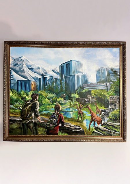 Эта картина представляет собой увлекательное путешествие в альтернативное будущее, где природа берет верх над цивилизацией. На переднем плане изображены двое путников, которые с удивлением наблюдают, как жирафы свободно разгуливают среди руин городских зданий, некогда символизировавших человеческий прогресс. За их спинами — снежные горы, олицетворяющие вечное величие природы, и яркая зелень, заполнившая пространство бывшего мегаполиса. Художник стремился передать идею хрупкости и одновременно силы окружающего мира, который способен восстановиться даже там, где казалось бы, цивилизация полностью вытеснила его. Работа вдохновляет задуматься о гармонии между человеком и природой, о важности бережного отношения к нашей планете. Размеры и материалы: Высота — 92 см, длина — 107 см, ширина — 4 см. Картина выполнена на холсте с использованием акриловых красок, что позволило художнику создать насыщенные цвета и текстуры, передающие глубину и атмосферу сцены.