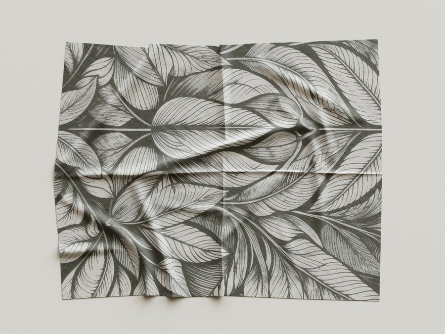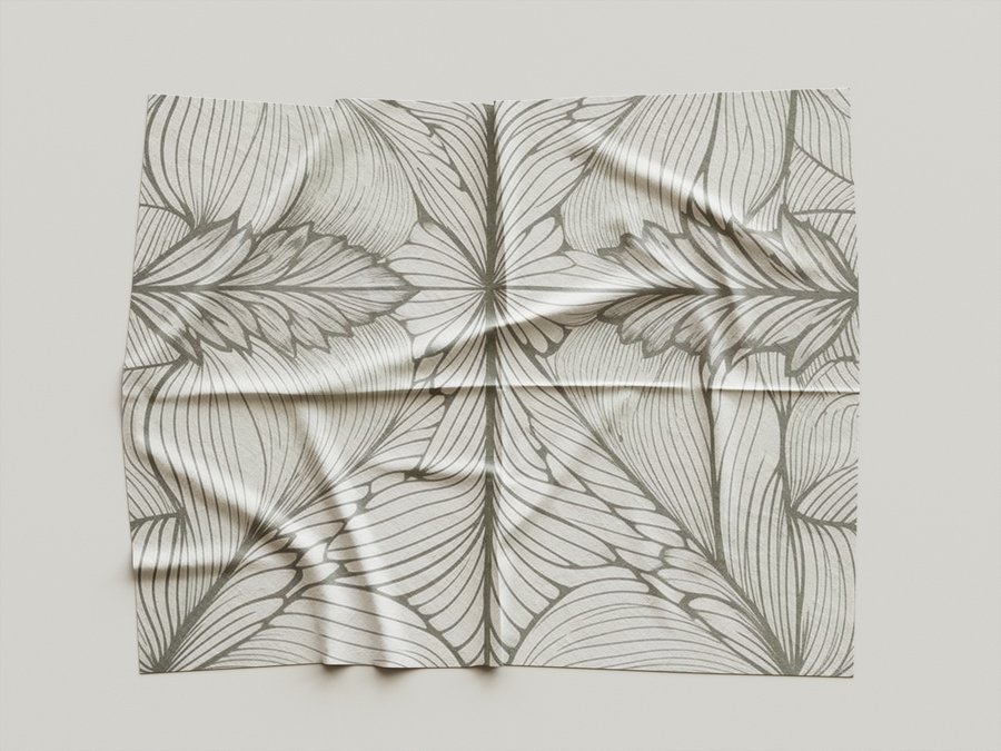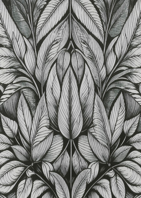 Prompt: a print of repeating symmetrical elements, a drawing of leaves of plants in black and white drawn with a ballpoint pen minimalism