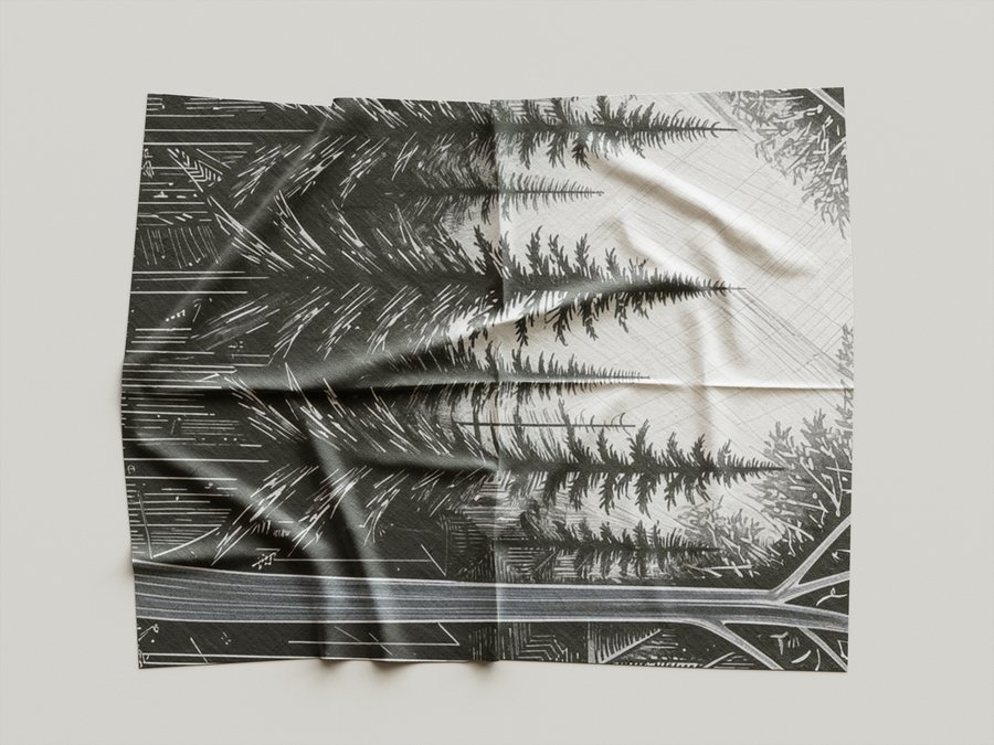 Prompt: a print of repeating symmetrical elements, a black and white drawing drawn with a black ballpoint pen. drawing of a dark gloomy spruce forest in the future a forest of fluffy fir trees