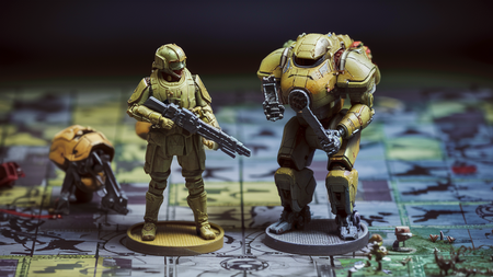 Слева генерация. Ideogram, промпт: «board game figures, standing on grid: futuristic empire soldier and machine.»