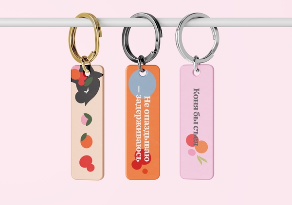 Promt: A plastic bunch of key chains: one keychain with a logo «SPESHKI», the other keychain is a delicious, painted gingerbread, the other keychain is a small strawberry berry. a bunch of keys are held in girl’s hand, soft light, a product scene, — 16:9