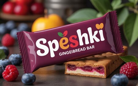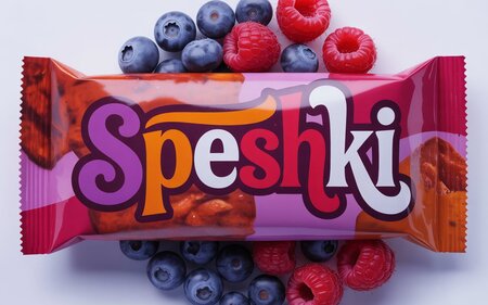 Promt: Make a glossy, bright package for a wide gingerbread bar with the 'SPESHKI' colorful (plum, orange, red, white) logo, cardust regular font, the colored packaging immediately makes the appetite run wild. The packaging is surrounded by mouth-watering berries, a product scene, professional photography, soft light creates an atmosphere pleasing to the eye.