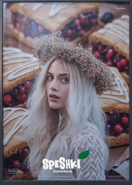 Promt: it’s a poster on a busy street with blurry people, because they’re walking fast. a poster: a blurry realistic photograph of a beautiful female model, European appearance, 28 years old, with long white hair, wearing a lacy white dress and a wreath of dry, wild flowers. In the background are lush gingerbread pieces with a mouth-watering berry stuffing. The image has a surreal, glitchy look, in the style of David Einstein and Tatsuo Miyajima.