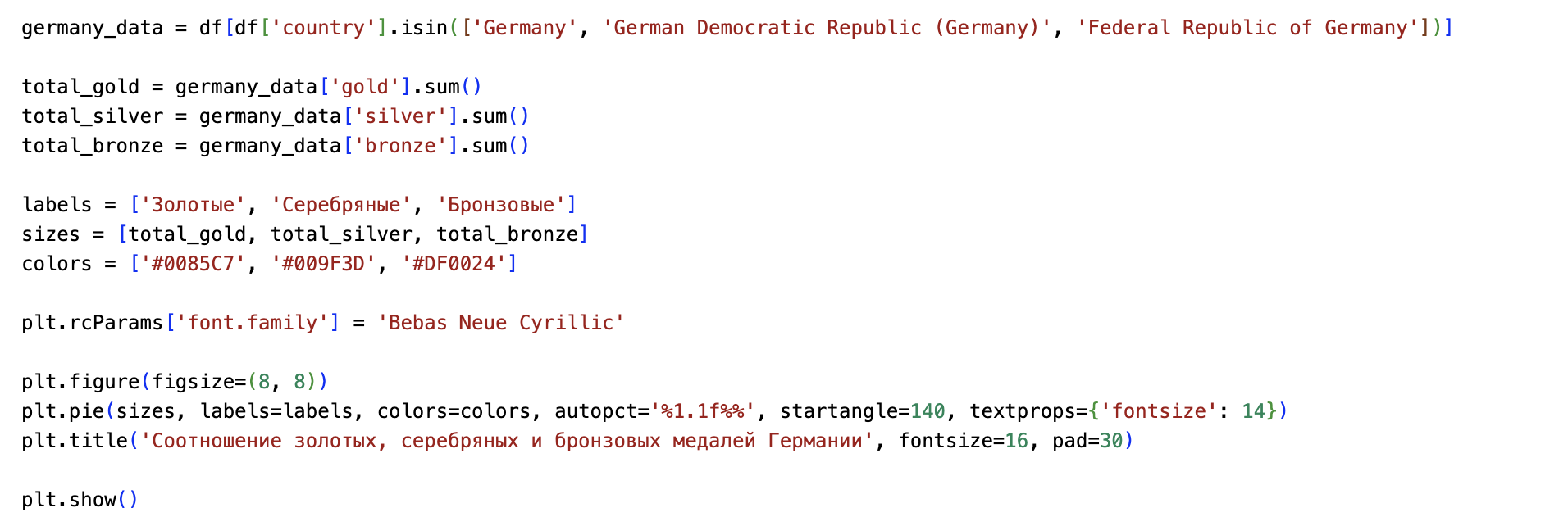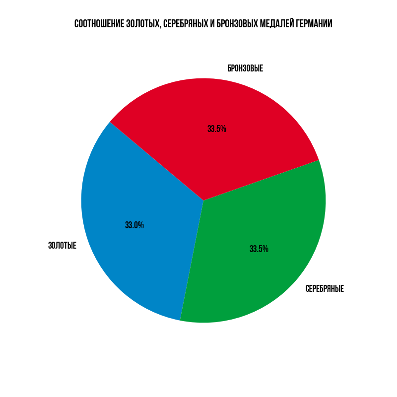 Какой процент золотых, серебряных и бронзовых медалей у 5 стран, у которых больше всех медалей за всю историю? Германия Круглая диаграмма