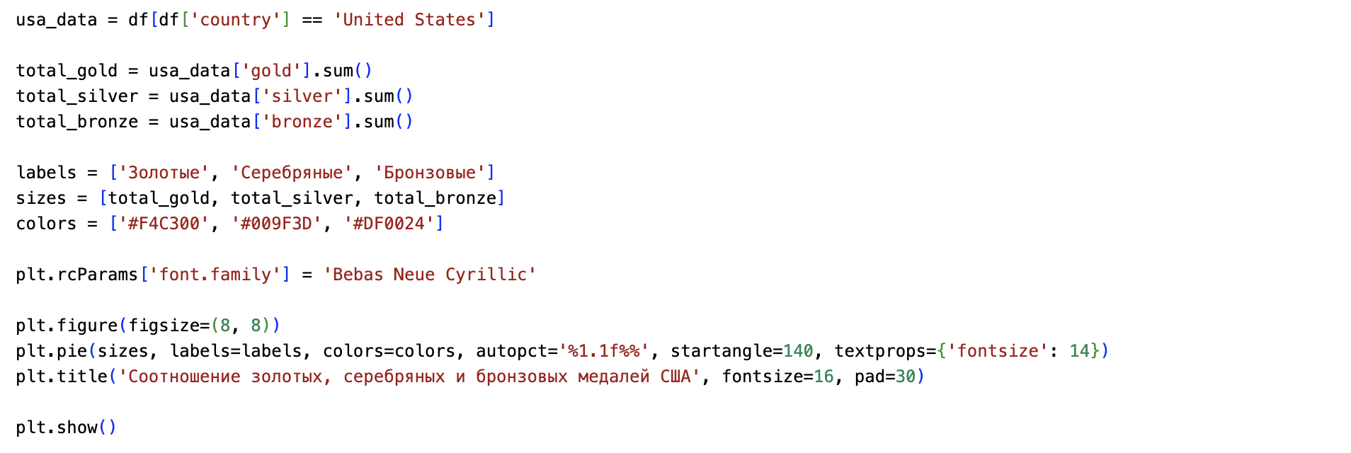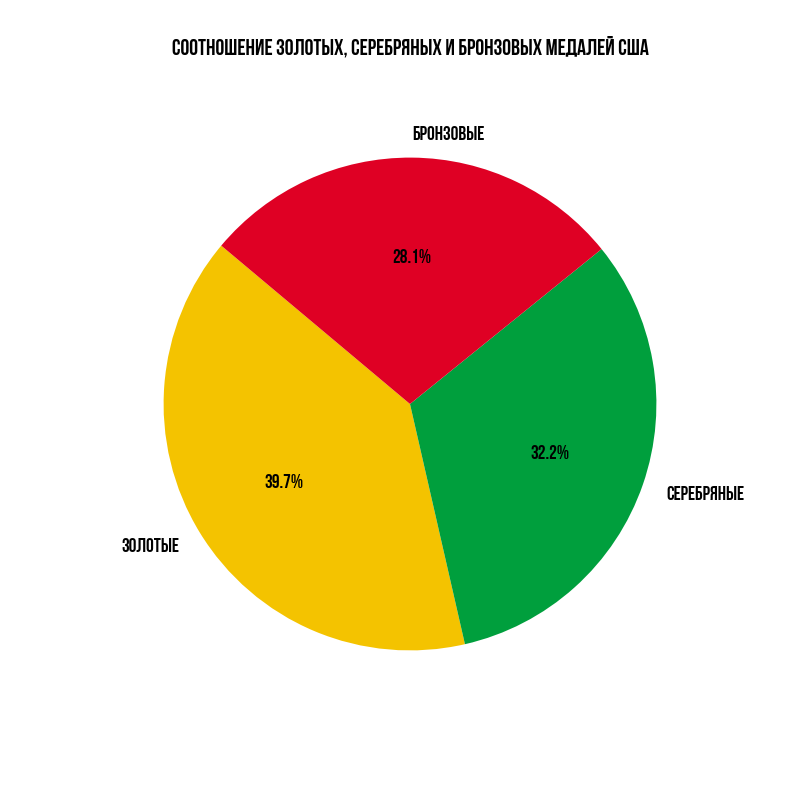 Изначально тема последнего графика выглядела так: «Какие страны являются лидерами по количеству золотых, серебряных и бронзовых медалей». В результате создания круглой диаграммы оказалось, что лидером во всех наградах являются США. Мне показалось, что такая диаграмма не очень интересна. Я подумала, что будет здорово сделать серию графиков, которые отражают процент золотых, серебряных и бронзовых медалей у 5 стран, у которых суммарно больше медалей, чем у остальных стран.