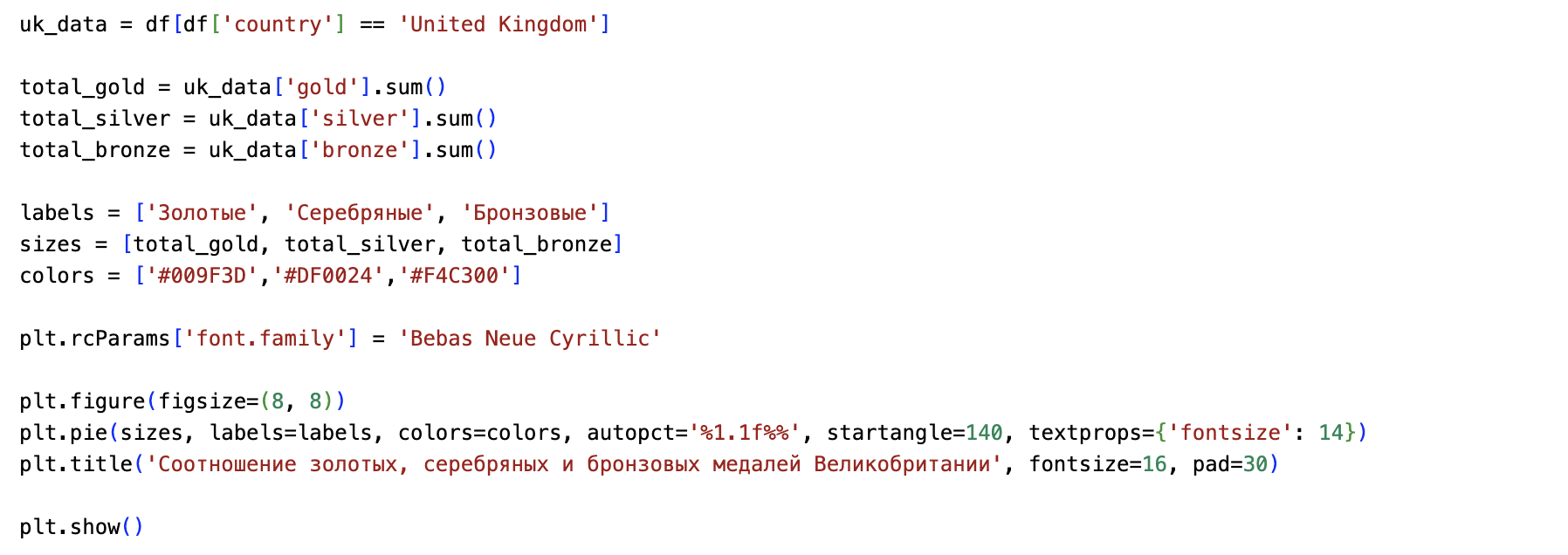 Для проведения анализа данных были необходимы следующие библиотеки и модули: — Pandas для загрузки и анализа данных — Matplotlib для визуализации данных и создания графико. — WordCloud для создания варианта визуализации данных с помощью облака слов. — Random для работы со случайными числами и генерации случайных значений, выбирая случайные элементы из списка. В проекте данная библиотека использовалась для рандомного окрашивания большого количества данных в фирменные цвета Олимпиады. — Matplotlib.font_manager для управления шрифтами в графиках.