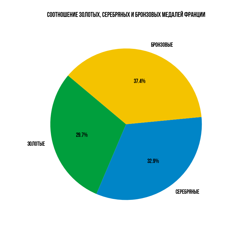 Какой процент золотых, серебряных и бронзовых медалей у 5 стран, у которых больше всех медалей за всю историю? Франция Круглая диаграмма