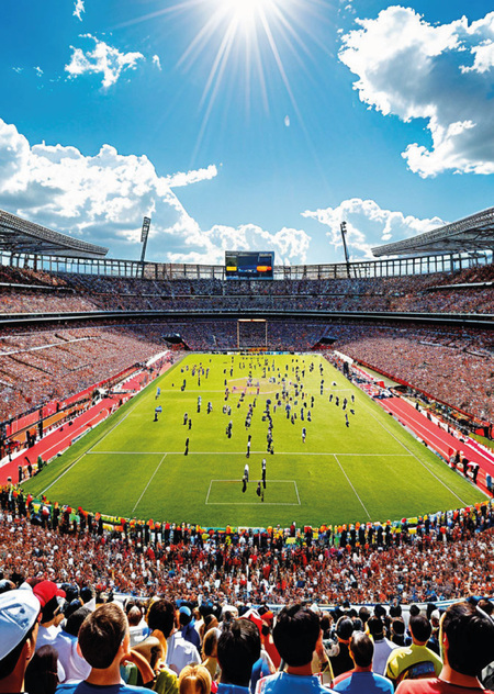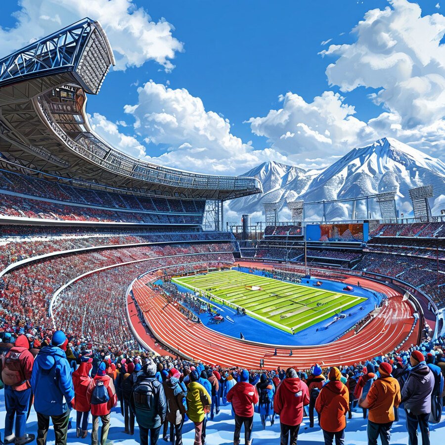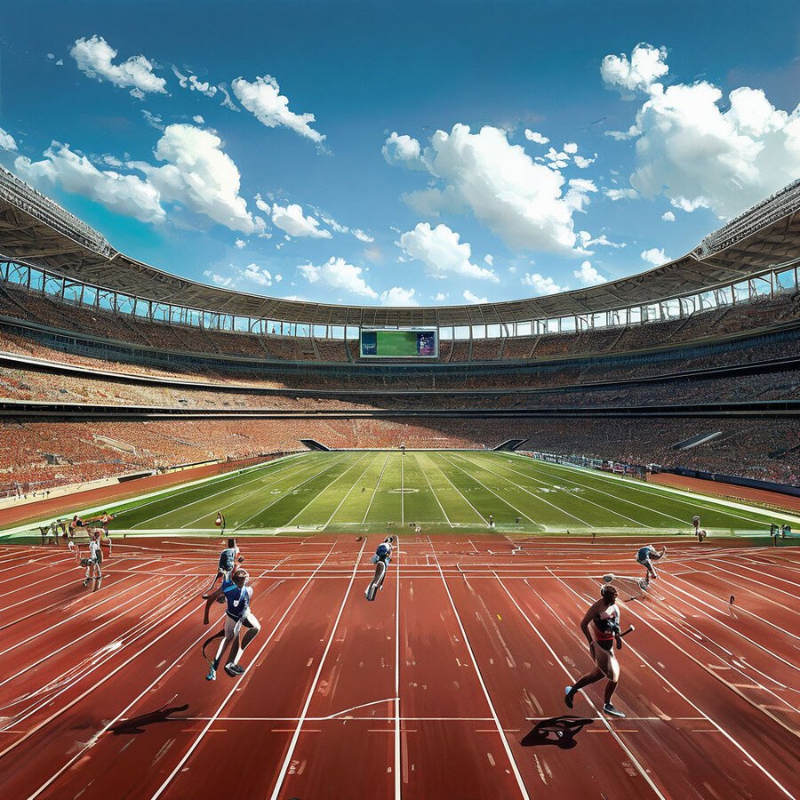 Промт: Атмосфера Олимпийских Игр, яркое солнце, голубое небо, большой стадион, большое количество зрителей, победа