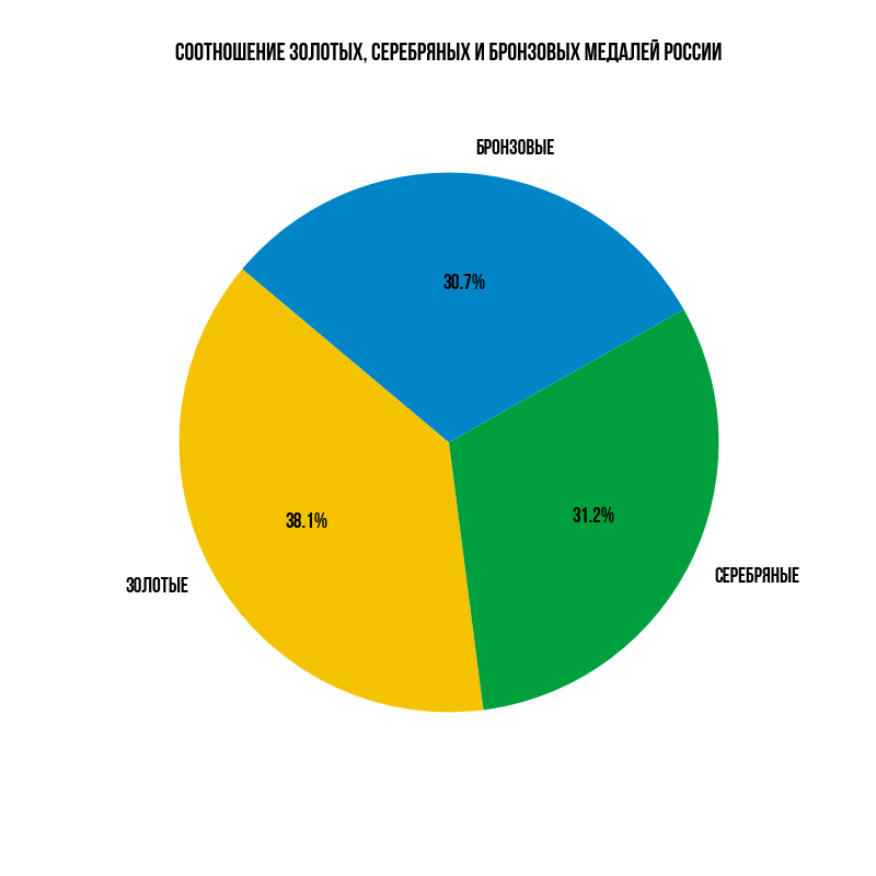 Какой процент золотых, серебряных и бронзовых медалей у 5 стран, у которых больше всех медалей за всю историю? Россия Круглая диаграмма