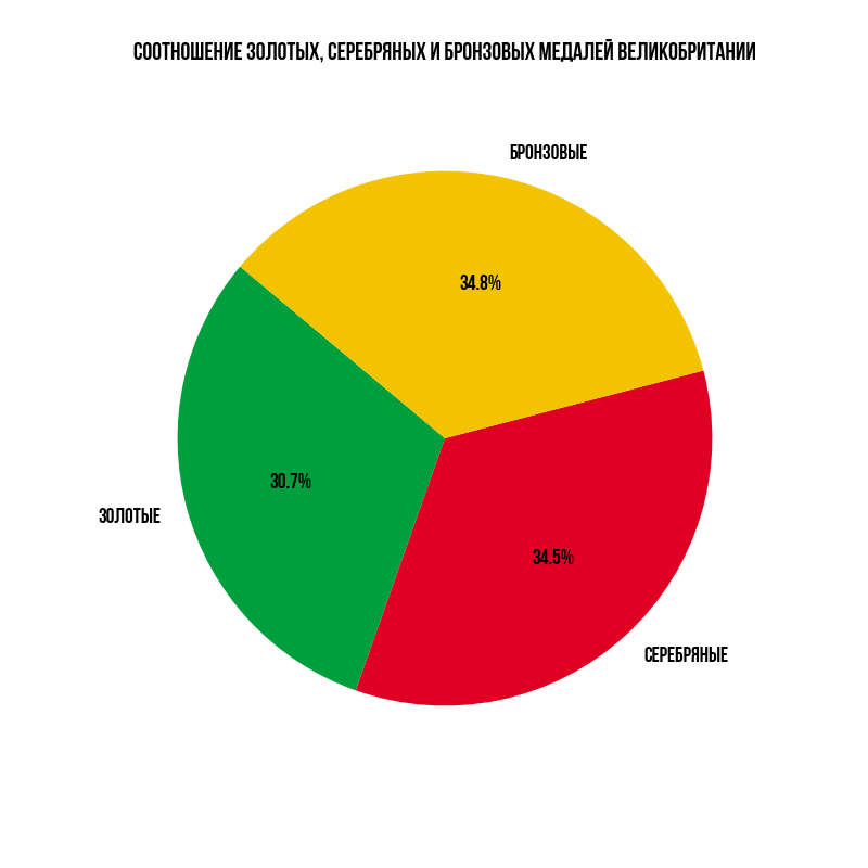 Какой процент золотых, серебряных и бронзовых медалей у 5 стран, у которых больше всех медалей за всю историю? Великобритания Круглая диаграмма