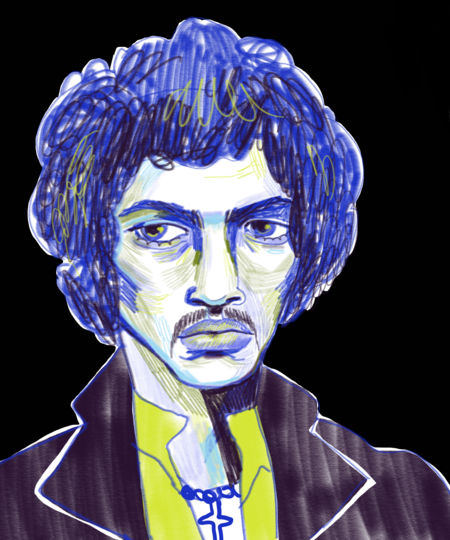 Серия портретов самых великих гитаристов по версии музыкального журнала Rolling Stone, которые не могут не затронуть стурны души слушателя. Из обширного списка, мною были выбраны музыканты чья деятельность и успех были на пике с 60-е по 80-е годы прошлого столетия. Также отбор проводился из личных музыкальных вкусов — работы всех представленных персон есть в моих плейлистах. В качестве техники было решено использовать фотоподмалевок, ограниченную холодную палитру с теплыми акцентами и штриховку. Формат иллюстрации — диджитал на размере А4.
