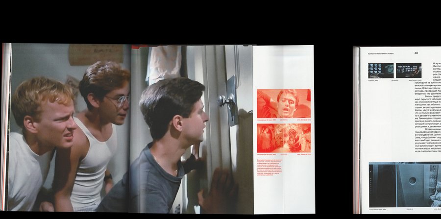 в издании есть клапаны между полосами, которые можно раскрыть и «подсмотреть». вся информация в них затонирована в красный, что проводит ассоциацию с тревогой и опасностью