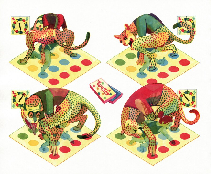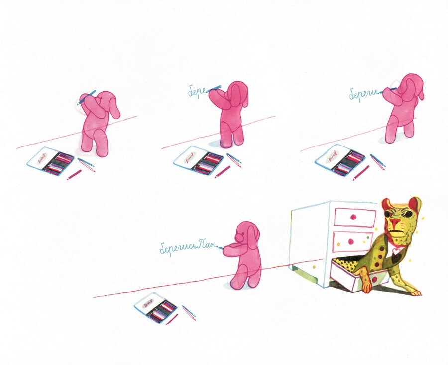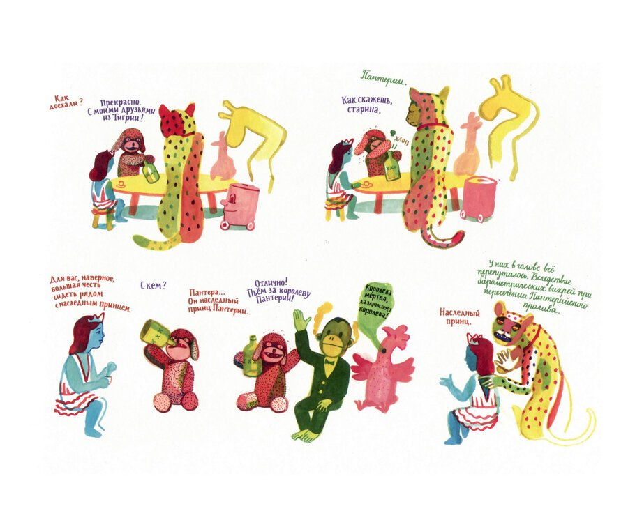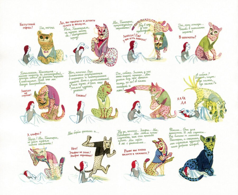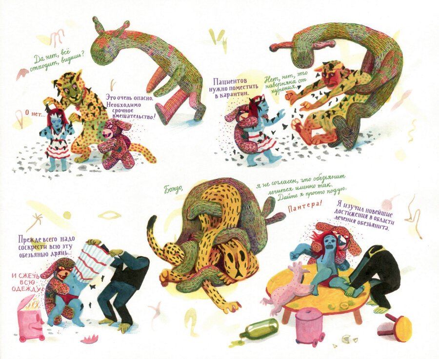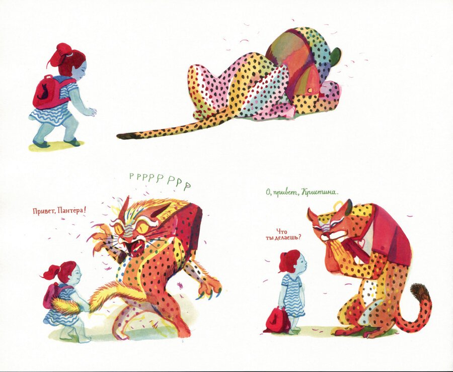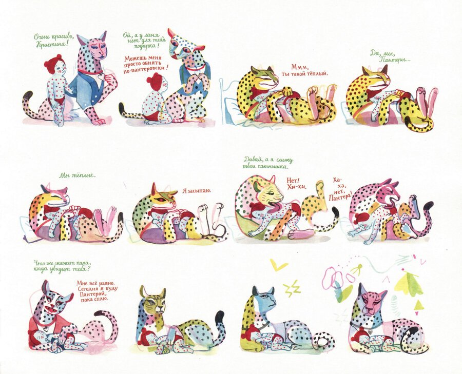 1. Пантера подстраивается под слова Кристины, чтобы понравиться ей; 2. Кристина в пятных, как Пантера, желает походить на него; 3. Бонзо пытается предупредить Кристину; 4. Пантера избавляется от Бонзо