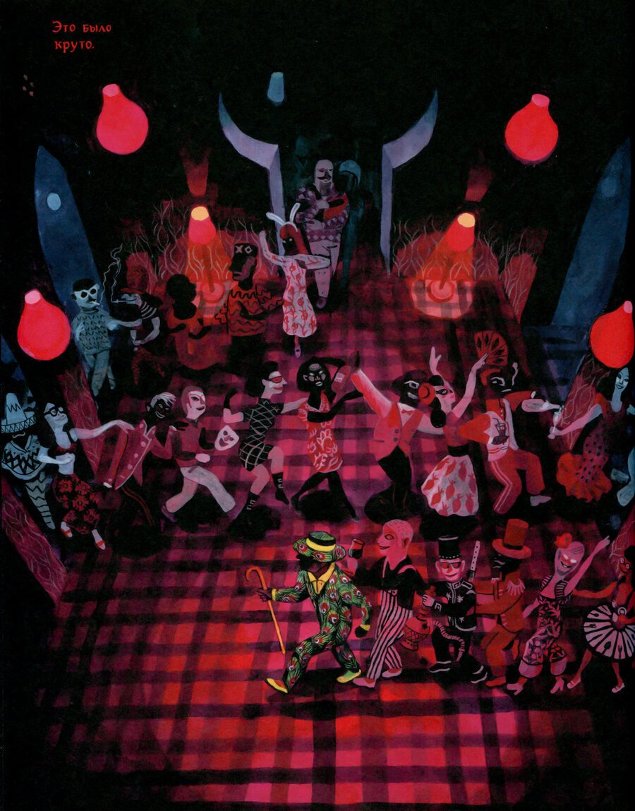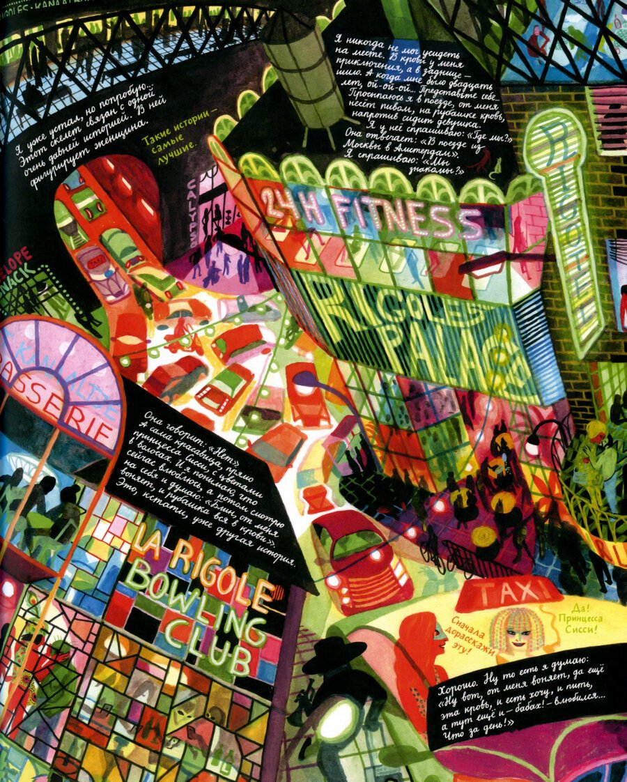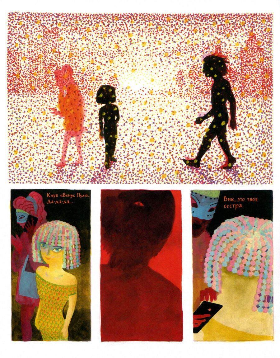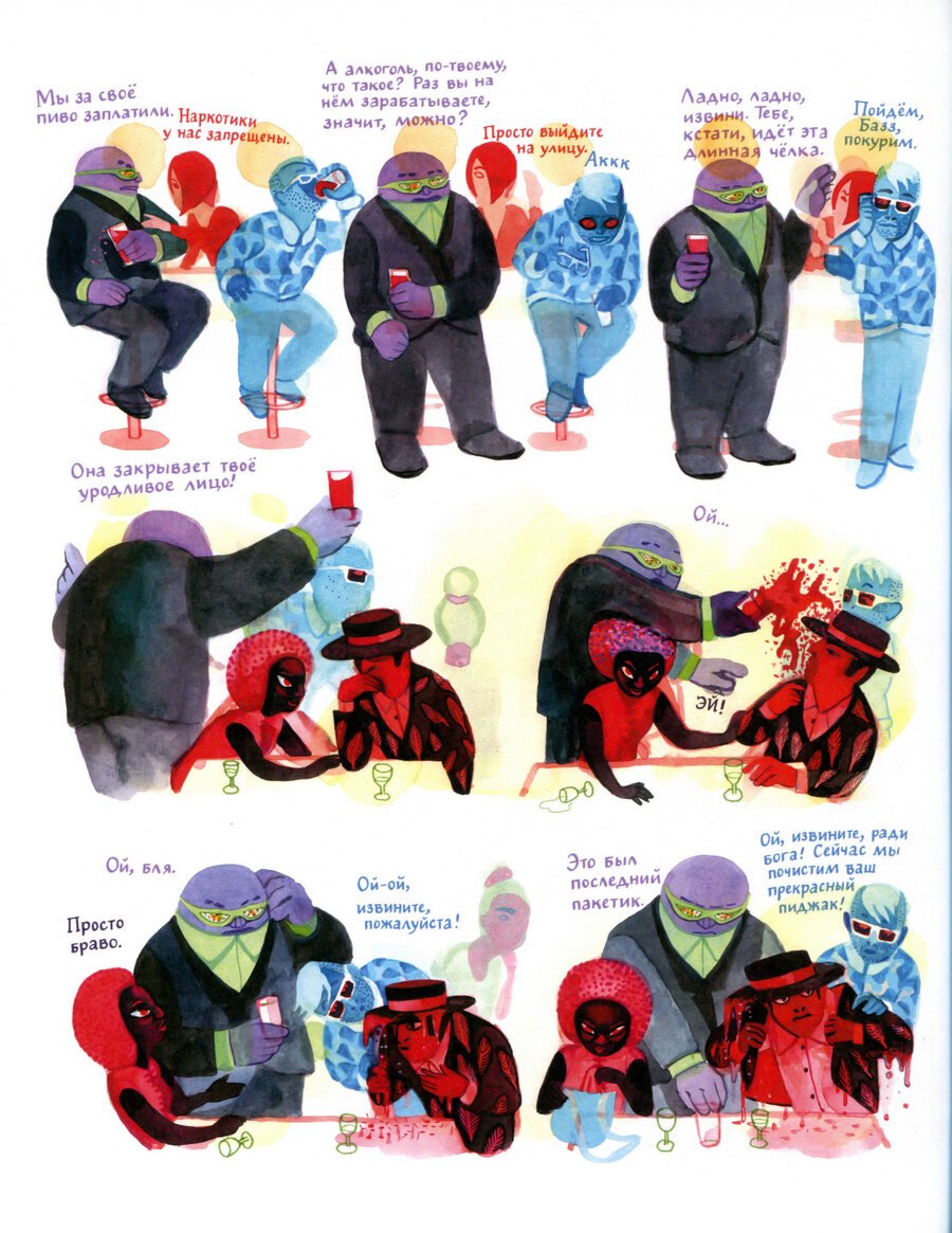 Несмотря на буйство красок, читатель с лёгкостью фокусируется на главном благодаря умело расставленным акцентам и контрастным пятнам. Отдельные объекты будто светятся из темноты клубов и улиц, создавая одновременно мрачную и праздничную атмосферу.