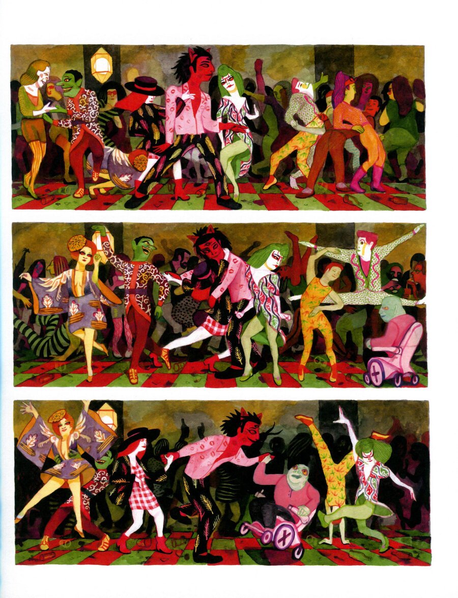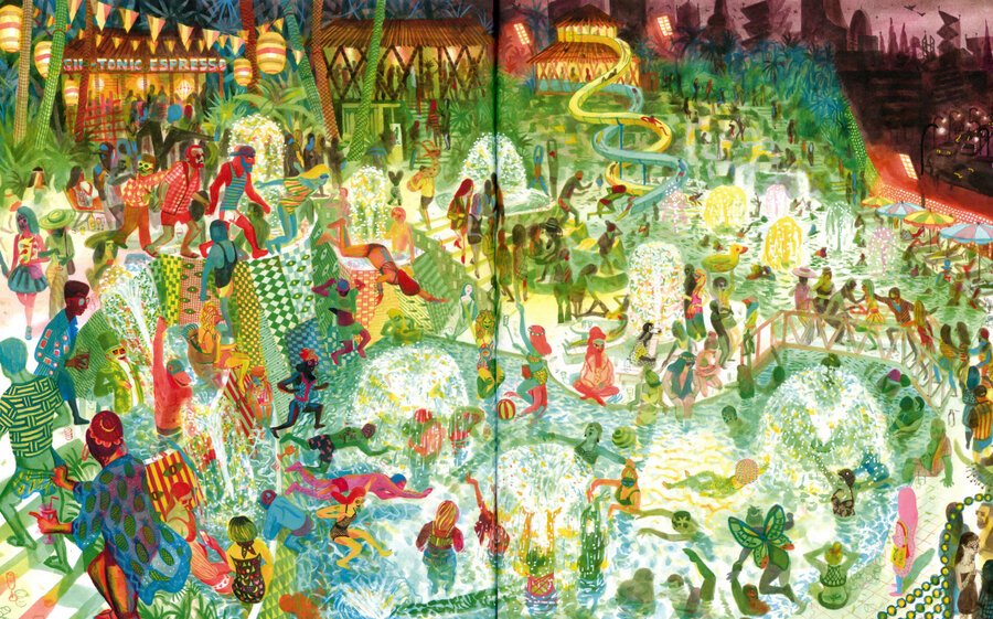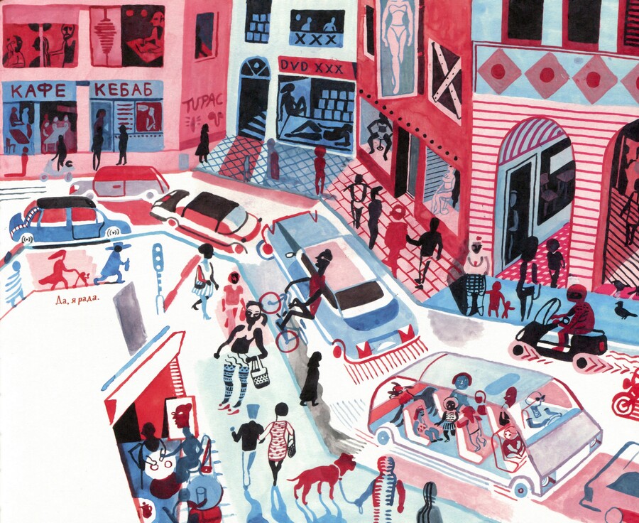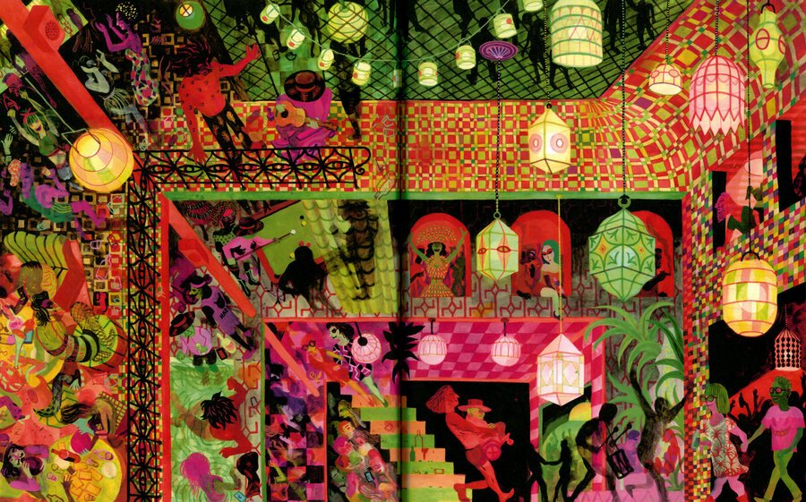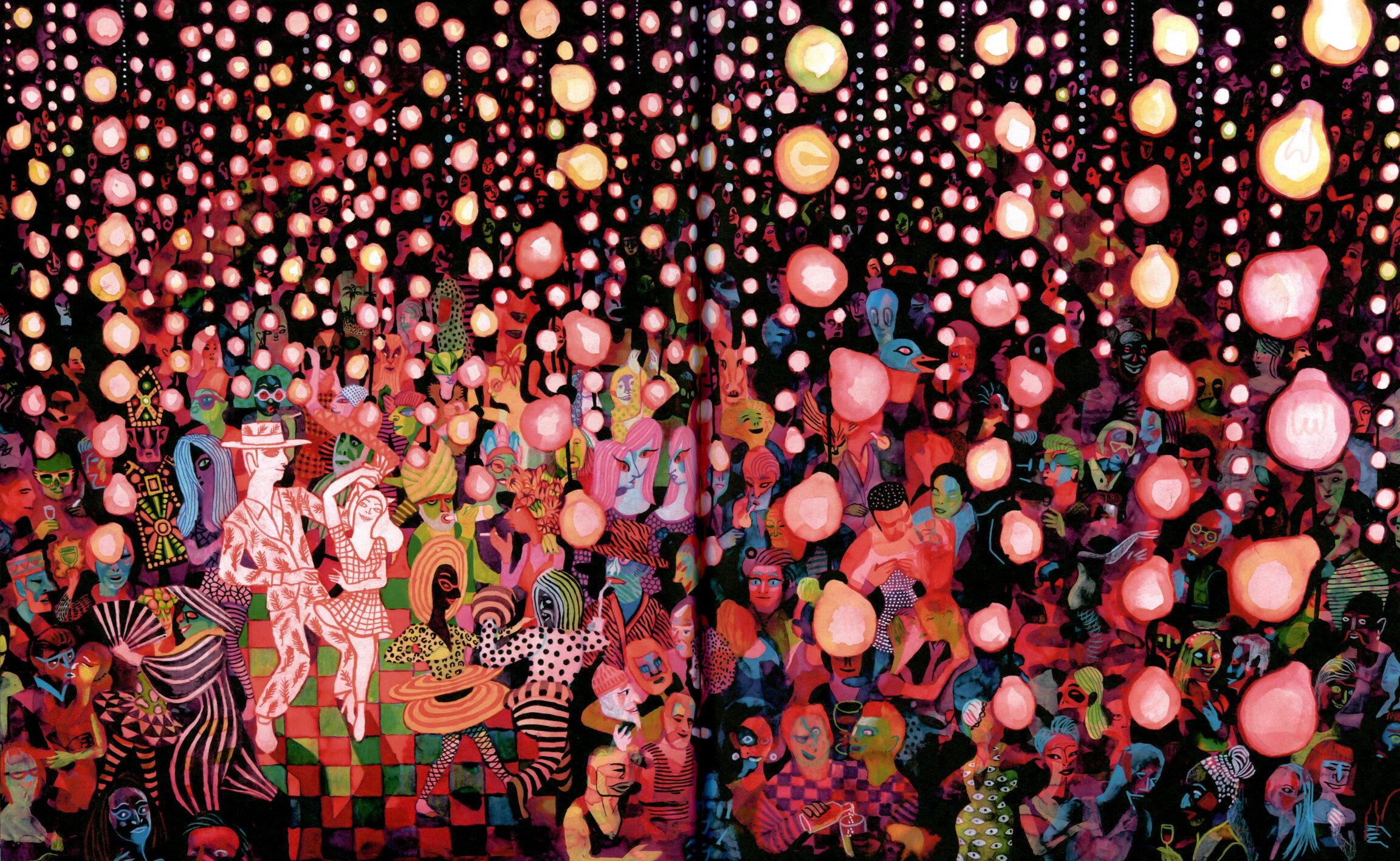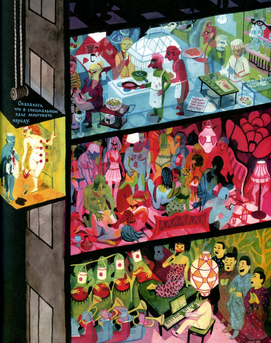 Несмотря на буйство красок, читатель с лёгкостью фокусируется на главном благодаря умело расставленным акцентам и контрастным пятнам. Отдельные объекты будто светятся из темноты клубов и улиц, создавая одновременно мрачную и праздничную атмосферу.