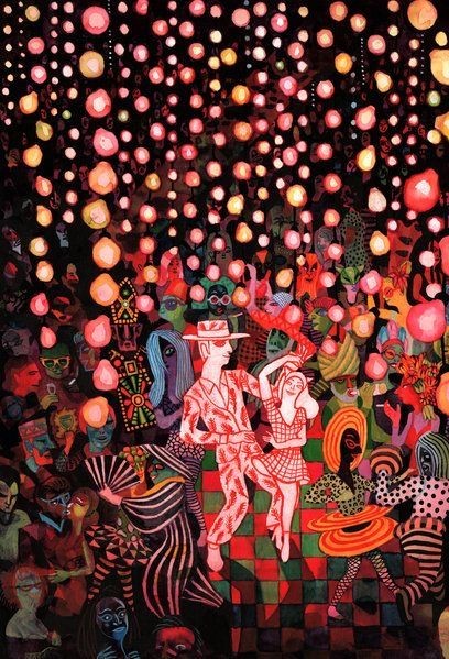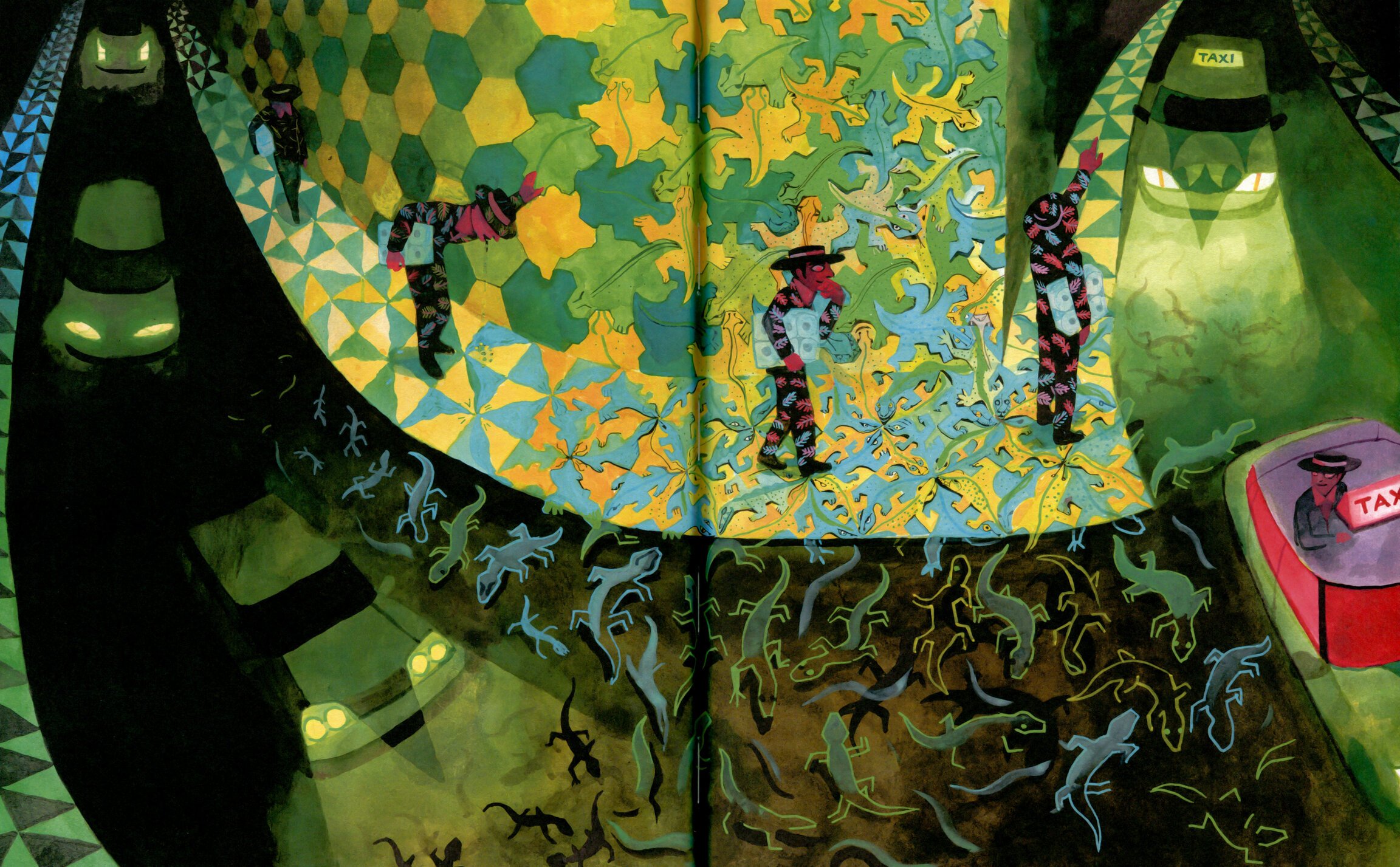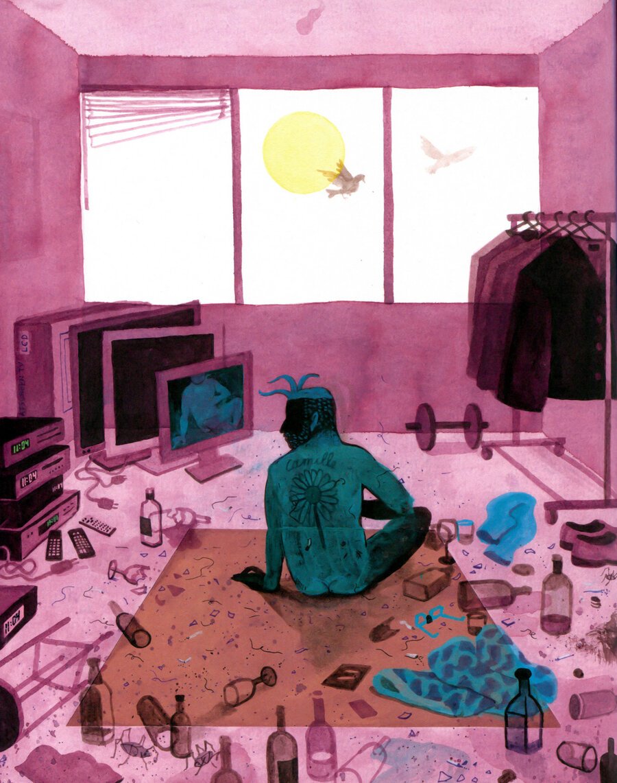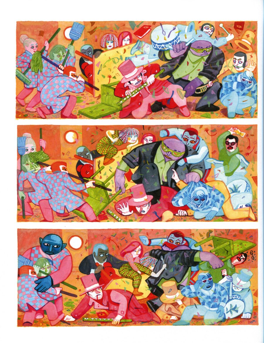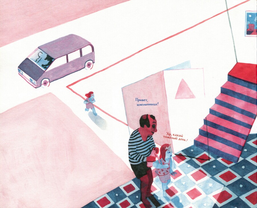 Несмотря на буйство красок, читатель с лёгкостью фокусируется на главном благодаря умело расставленным акцентам и контрастным пятнам. Отдельные объекты будто светятся из темноты клубов и улиц, создавая одновременно мрачную и праздничную атмосферу.